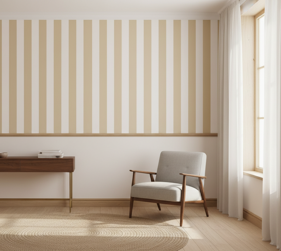 Añade una sensación de altura y amplitud a tus paredes con este diseño de rayas simétricas. Las rayas de este diseño crean una atmósfera de calma y orden, perfecta para estilos decorativos que van desde el clásico renovado hasta el estilo costero o nórdico.