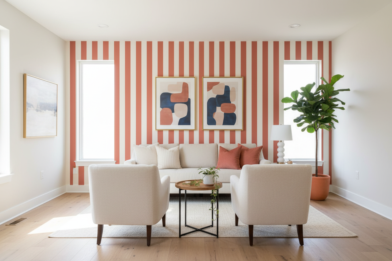 Diseño de rayas verticales de ancho uniforme que ayudan a elevar visualmente los techos, haciendo que las habitaciones parezcan más espaciosas y aireadas.