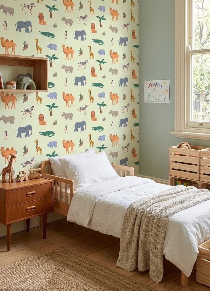 Transforma cualquier habitación en un oasis de ternura con nuestro patrón “SAFARI”. Este diseño destaca por su estética flat design con bordes suaves y una paleta de colores tierra que aporta serenidad y alegría al espacio.