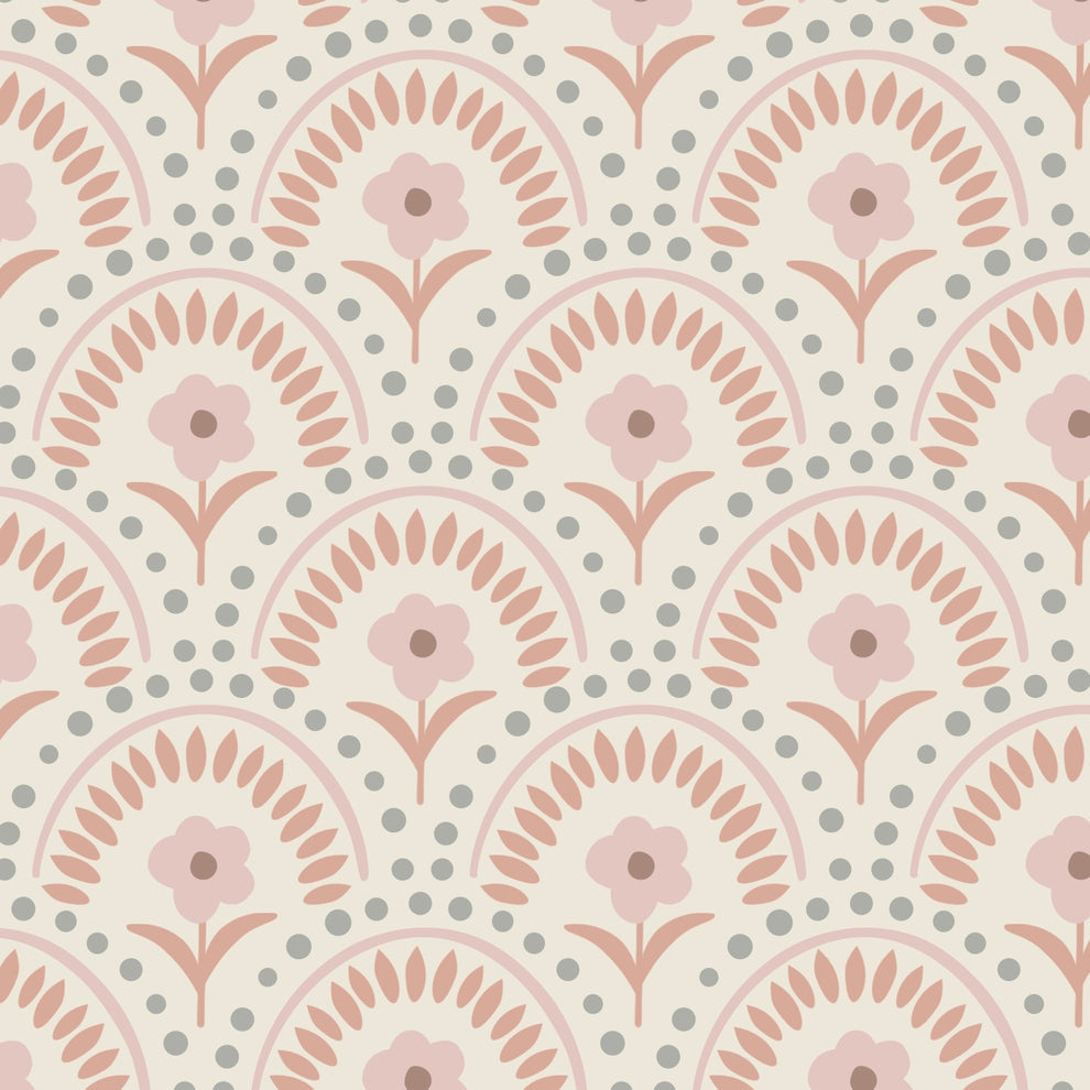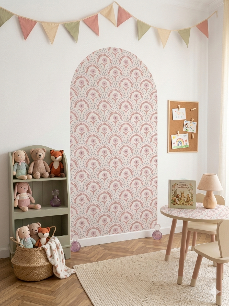 La paleta de colores combina tonos rosa empolvado y beige cálido sobre un fondo claro, creando una atmósfera dulce, delicada y acogedora. Su estética encaja perfectamente en dormitorios infantiles o espacios de juego, aportando un toque romántico y atemporal sin recargar el ambiente.