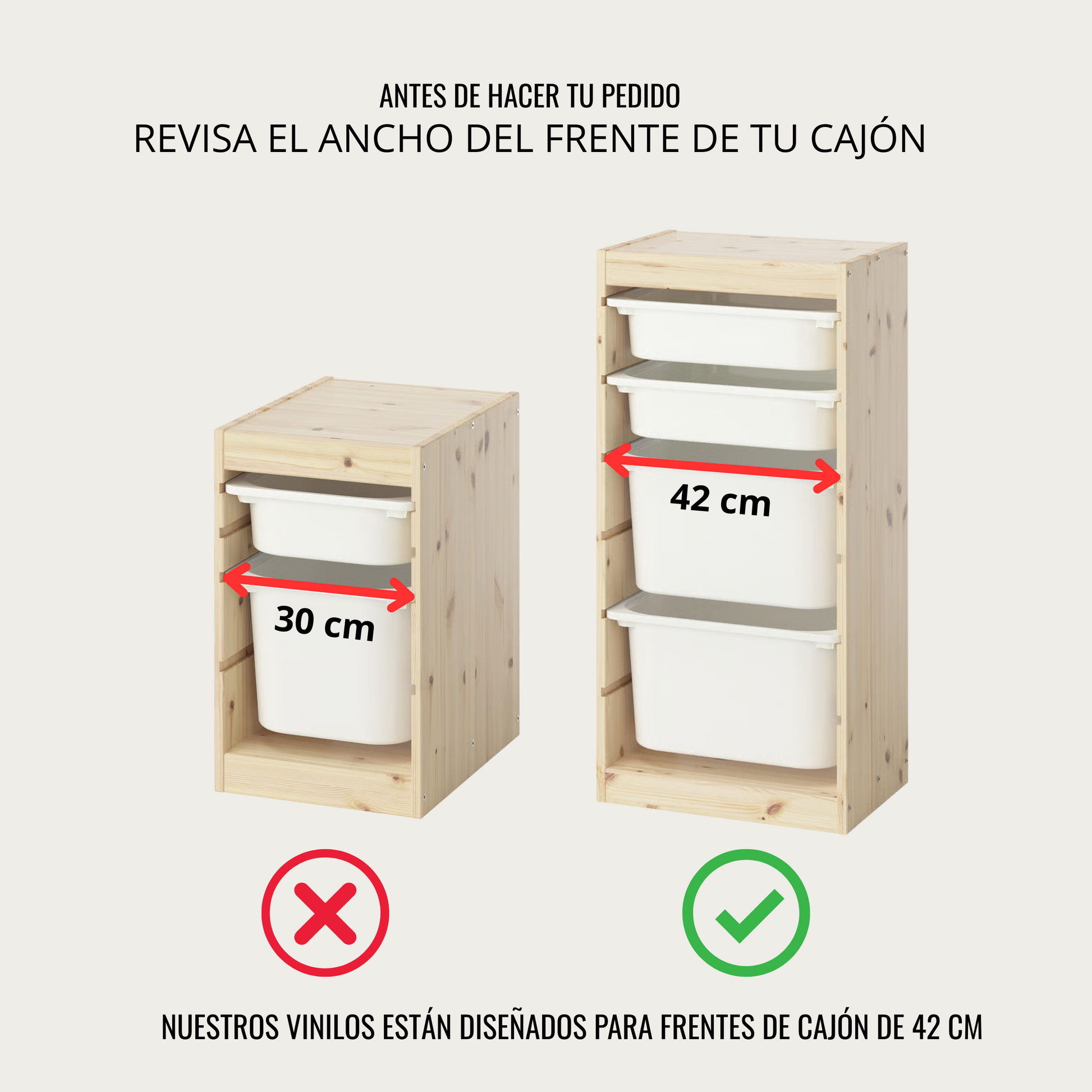 Los tamaños de los vinilos son válidos para frente de cajón de 42 cm de ancho.
