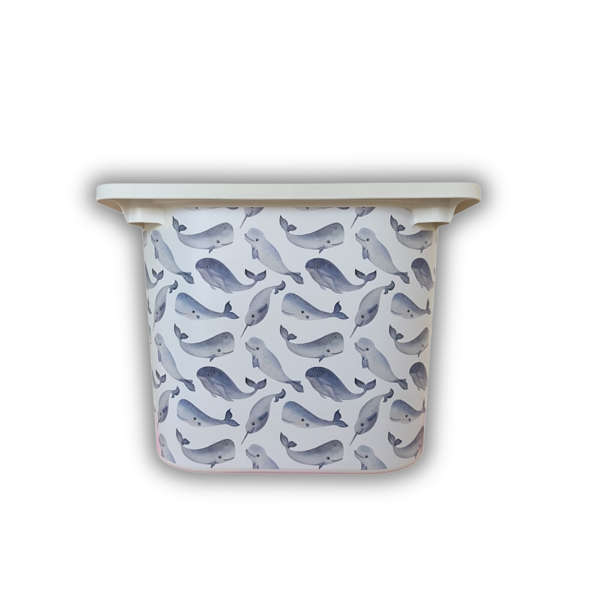 Vinilo decorativo para caja TROFAST de Ikea, con un encantador estampado de ballenas en tonos azules. Perfecto para dar un toque marino, dulce y relajante a la habitación de los más pequeños.